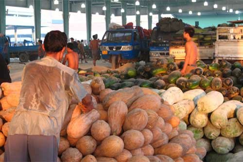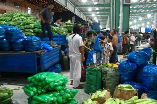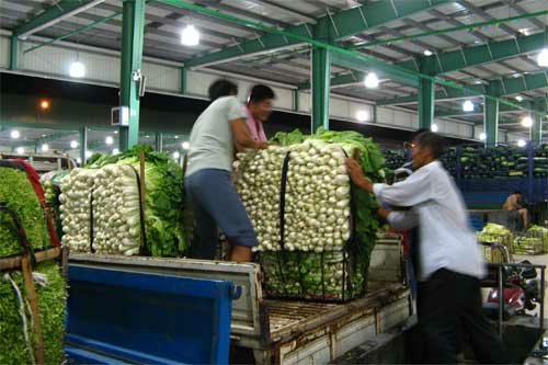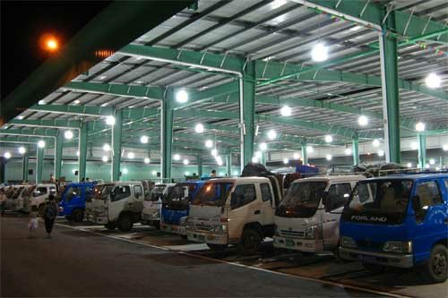 昨晚11点左右,忙碌了一天的城市逐渐告别喧嚣进入梦乡,而位于黄巷北滨路的朝阳蔬菜批发新市场则是另一番洞天。记者驱车进入市场时,庞大的停车场已经停放了数十辆大货车,门外还有大货车不断涌入。远远向交易区看去,一盏盏晶莹剔透的吊灯将三个绿色大棚照得如同白昼。交易区内,货车一字排开,经营户们开始忙碌地将车上的各类蔬菜卸在地上并整齐地堆放好。渐渐地,货车越来越多,小商小贩的电瓶车也随之不断涌入。由于交易市场有一个主通道,四个副通道,形成车辆内部环形圈,所以现场井然有序,并没有出现拥堵情况。