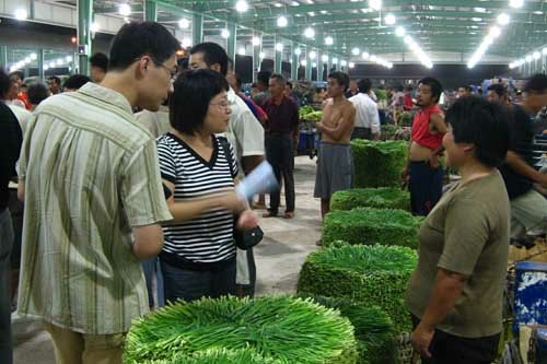 在外菜区交易大棚内,来自盐城大丰的经营户张玉祥正满头大汗地拾掇他的蔬菜。“我今天特意早走的,本以为还会比较挤,没想到交通很顺畅。”为迎接开市,老张和他的6吨蔬菜昨晚八点多钟就到了。他欣喜地说,新市场给他的第一感觉就是交通便利,秩序比以前好,管理也更加严格了。来自山东寿光的老任也有同感。他告诉记者,以前他的运输车从高速公路下来到老交易市场要半个多小时,有时晚到了还要堵上半天,汽车的轰鸣声不时引来周围被吵醒居民的责骂,“现在好了,高速下来一会就到了,还不会堵。” 在1万多平方米的本地菜交易大棚内,来自朝阳各蔬菜基地的2000多户菜农,整齐有序地将各自蔬菜排成长长的四列。鸿山镇菜农侯建南指着整齐摆放着的三筐韭菜说:“这个地方多舒畅啊,以前只能在前面摆一筐,像我现在占的位置在老市场要挤三个人呢。”一旁的菜农孙永明接话说:“你看现在两排菜之间的过道有3米左右呢,以前根本就没过道,筐挨筐人挤人,地面高高低低,底下都是菜滴下的水,现在干干净净的。”最令他们高兴的还是可以节省不少时间,他们告诉记者,以前老市场交易场所小,他们都是要在前一天下午5点左右就进场,挨到次日凌晨才开始交易,凌晨三四点交易结束后,由于交通阻塞,根本就出不去,只好等到早晨六七点钟才能离开。如今不一样了,可以晚来早退市,在市场熬夜的时间从原来10多个小时缩短到四五个小时,人舒服多了。
