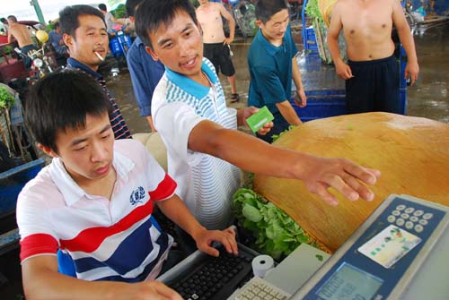 这是由国家商务部实施十城市肉菜可追溯体系项目的主要环节。无锡朝阳农产品大市场采用现代信息技术,结合信息化电子称重和可追溯编码体系,实现蔬菜交易全过程监管。
