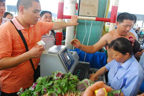 6月25日下午,在无锡朝阳农产品大市场地产蔬菜交易区的客商,迎来了首台电子秤一体化交易结算机的首张出票。