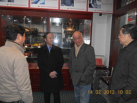在集团董事长张海良先生、总经理杨兴德先生的陪同下,傅会长和王秘书长兴致勃勃的参观了无锡文化工艺品市场,先后在中国陶都陶瓷国际博览中心无锡艺术馆、国家级非物质文化遗产南京吉祥云锦等展馆欣赏了众多国家级工艺美术大师们的艺术珍品,对展馆内精雕细刻、美轮美奂的工艺展品赞不绝口,对朝阳集团大胆涉足文化产业、繁荣文化市场的创举表示认同和赞许。