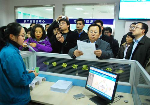 在位于无锡朝阳农产品大市场的蔬菜备案中心,常司长一行仔细查验了蔬菜经营者注册备案流程。米乐官方网页版总经理杨兴德向督查组汇报了米乐官方网页版依托农产品大市场,并结合本溯源项目,投入大量的人力、资金,切实开展农产品电子化交易结算,认真实施农贸市场溯源节点管理,在批发市场、农贸市场、连锁超市农产品追溯等方面均取得了显著的成效。