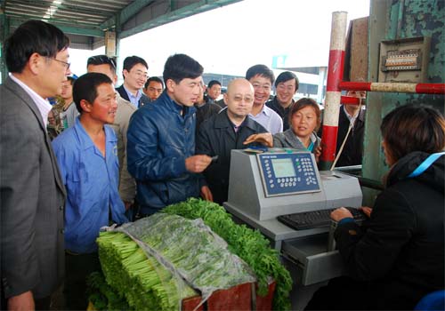 在蔬菜交易现场,米乐官方网页版总经理杨兴德向部领导介绍了网络化的电子秤交易架构,这些交易信息通过网络,向下游零售环节传递产地信息。