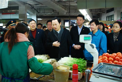 朝阳集团领导向市政协领导详细汇报了朝阳集团的发展现状和为确保“菜篮子”平价供应所做的工作和成果。在天惠超市朝阳店平价蔬菜区,市政协领导仔细查看当天平价蔬菜供应的品种和价格,查看肉菜溯源系统的运行情况,并详细询问天惠超市在节日期间平价商品的供应和储备情况。在朝阳农贸市场和无锡文化工艺品市场,周敏炜主席数次走到摊位前,与经营户交谈,询问每天销售情况以及节日期间的准备工作。