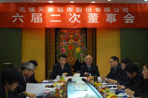 2013年12月14日上午,无锡天惠超市股份有限公司在集团公司三楼第二会议室召开了六届二次董事会会议,董事会成员:张海良、张庆卿、杨兴德、华泉荣、钱韧、邵裕妹、朱健祥、张恒、罗志坚、杨小虹、陈晓出席了会议。监事会组成人员列席了会议。会议由董事长张庆卿先生主持。