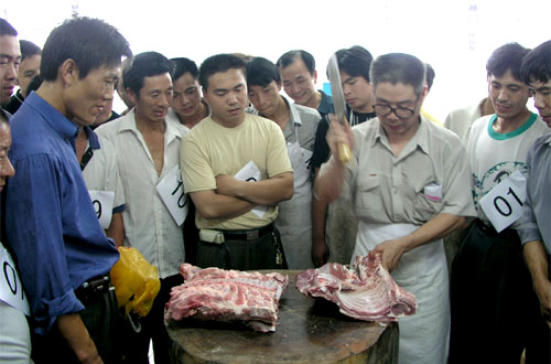 技术鉴定分“三段、剔骨、斩大排、一刀准、速度”五个项目进行考评。以无锡市肉类协会副会长、天惠小木桥店经理顾荣瑞领衔的考评组根据11位员工的实际操作技能,逐一进行了认真细致的评分,排定了11名员工的技能档次。