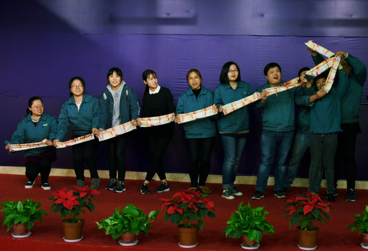 第二板块是团队活动环节,共有“团队组建”、“入队测试”、“创意造型”和“猴子捞月”四个部分。参会代表通过随机抽号的方式,临时组建成8个团队。在入队测试中,每个团队通过“你做我猜”的游戏,增进了成员间的交流和互动。 在创意造型环节,8个团队分别给自己取名为活力之队、梦想队、LOVE队、追梦人之队、筑梦队、团结队、团结力量队和圆梦队。在舞台上,他们分别借助魔术头巾道具摆出一幅幅创意形体造型,并喊出了响亮的团队口号,现场也响起了阵阵热烈的掌声。  最后的“猴子捞月”活动则考验了每个团队的分工、协作意识和成员间的充分信任。  通过评审组对团队活动的综合评分,7号朝阳团结之队以微弱优势夺得了整个活动的第一名。团队成员分别是来自朝阳股份的王艺、席荦,天惠超市的蒋永峰、任新华、丁蓓君、翟俊波、沈维、刘敏亚,储运公司的祁汉忠,和朝阳班2015级学生靳佳慧。  张董事长最后做了重要讲话,她勉励大家要认真做人,踏实做事,传承朝阳精神,传承好的传统和作风,展现青年人的朝气和活力,力争为朝阳事业创佳绩、立新功!慷慨激昂的讲话感染了每一个参会人员,也为活动画上了圆满的句号。 会后,每个青年代表都将填写一份职业生涯规划表和员工满意度调查表。相信通过此次活动,每一个青年干部职工都能够认真审视自己的职业生涯定位,更好的规划今后的职业发展目标,为实现“百年朝阳”梦想而贡献更多的智慧和力量。朝阳有梦,梦想就在前方,路就在脚下。朝阳青年们,让我们手牵手,心连心,共筑朝阳梦! |