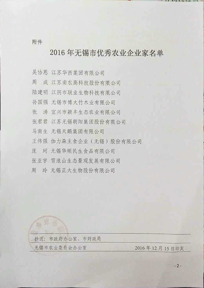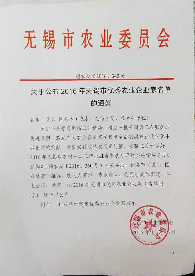 根据无锡市农业委员会锡农委[2016]343号文件精神,米乐官方网页版董事长张君君被评为“2016年无锡市优秀农业企业家”。