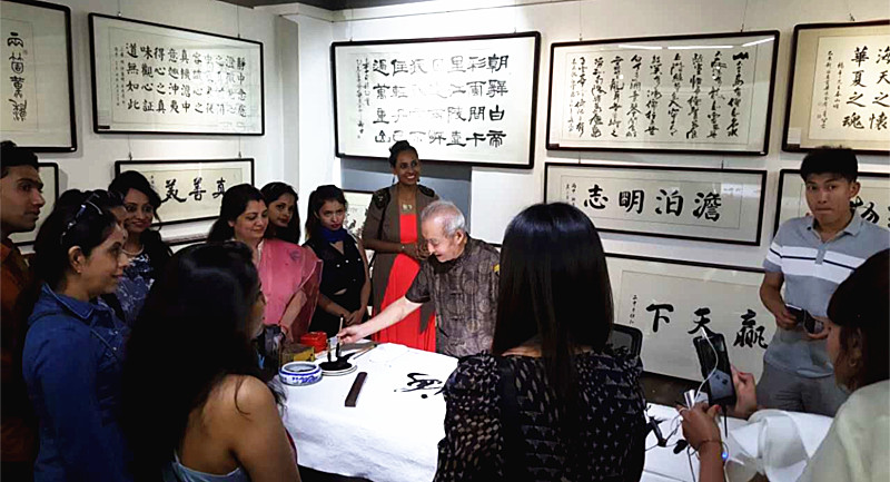 5月27日下午,朝阳茶叶市场艺宝韵美术馆里来了一群特殊的客人。原来他们是来自印度驻华使馆的工作人员和宝莱坞的演艺明星们,在梁溪区经信局的联系和陪同下,到艺宝韵美术馆进行参观。90多人的参观团让美术馆的气氛显得格外热闹。这些大眼睛、棕色皮肤的帅哥美女们,三五成群,有的在欣赏着各种类型的的绘画作品,有的围坐在茶桌前,与馆里人员品茗交流。无锡花鸟画研究会的书画家们还在现场挥毫泼墨,吸引了外国友人围在一起驻足观看,并且纷纷与书画家合影留念。通过此次活动,加深了外国友人对中国艺术文化的了解和认识,为中外艺术交流起到了一定的桥梁作用。