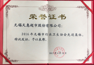无锡天惠超市股份有限公司荣获2016年度无锡市行业卫生协会先进集体称号