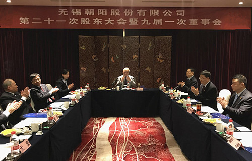 无锡朝阳股份有限公司第二十一次股东大会暨九届一次董事会于4月9日在苏州金鸡湖大酒店隆重召开。公司实到股东4人,占总股本的100%。公司第八届董事会、监事会全体成员及财务部长参加了本次会议。会议由董事长张海良先生主持。 会议审议通过了《行政工作报告》、《财务工作报告》等报告。会议还选举产生了无锡朝阳股份有限公司第九届董事会、监事会。新一届董事会、监事会召开了第一次会议,会上一致选举张海良先生为无锡朝阳股份有限公司第九届董事会董事长,选举钱韧先生为无锡朝阳股份有限公司第九届监事会主席。