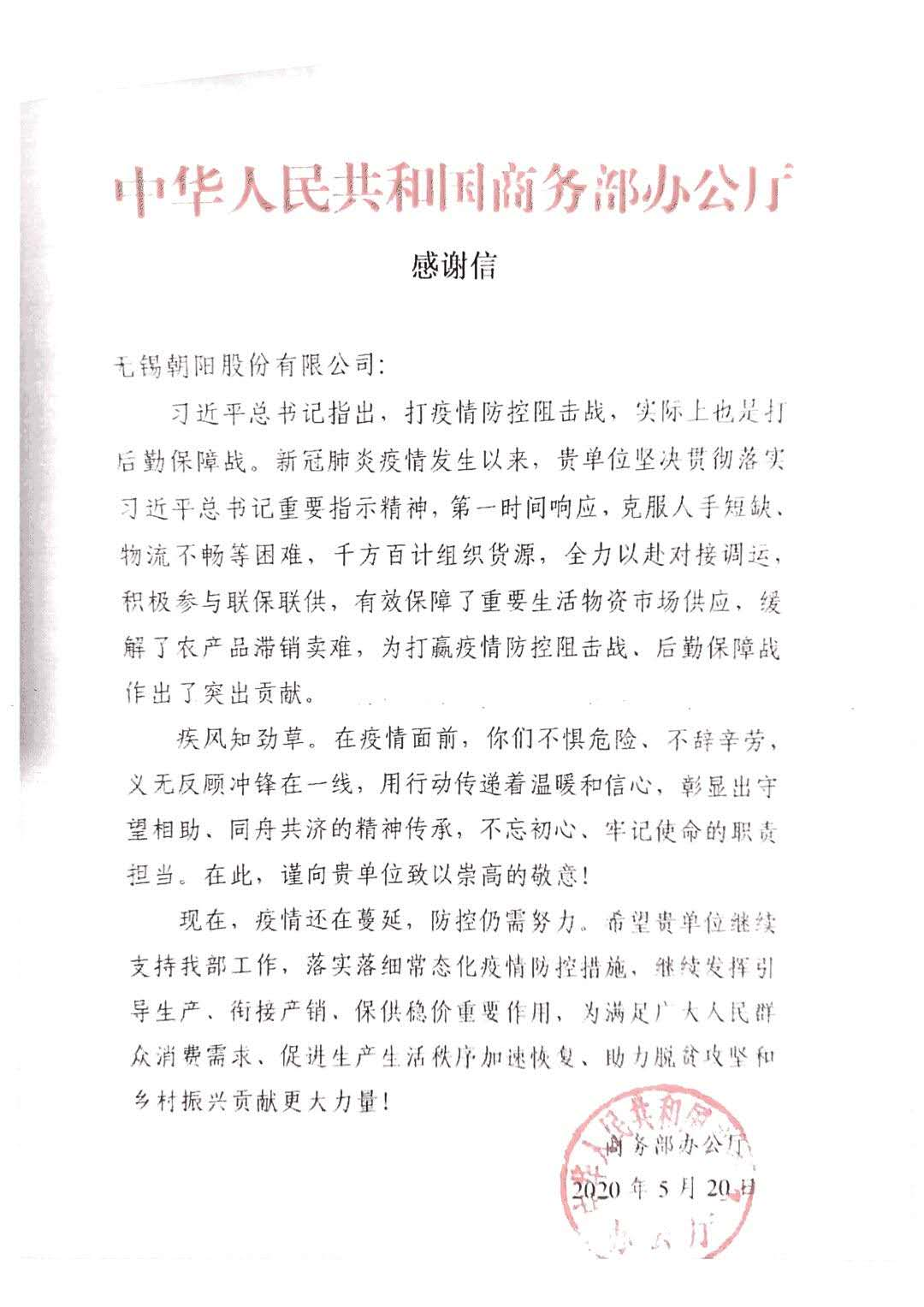 近日,中华人民共和国商务部向无锡朝阳股份有限公司发来感谢信。信中充分肯定了我公司作为农业产业化国家重点龙头企业,在此次新冠肺炎疫情期间所做的工作,感谢朝阳农产品大市场、经销商在组织货源、对接调运、参与联保联供应、保障重要生活物资市场供应、缓解农产品滞销卖难等方面做出的突出贡献。