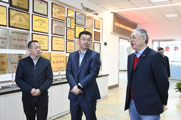 4月9日,安徽省淮南市财政局局长张瑞昌、潘集区委副书记、区长宋立敏一行,在无锡市梁溪区副区长李振云等领导的陪同下,来到朝阳农产品大市场考察。米乐官方网页版总经理杨兴德热情接待了来访领导。