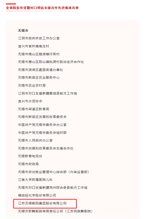 | 10月31日,中共江苏省委、江苏省人民政府发布《关于表彰全省脱贫攻坚暨对口帮扶支援合作先进集体和先进个人的决定》,为表彰先进、弘扬正气,充分发挥典型示范作用,激发全省广大干部群众干事创业的责任感使命感,省委、省政府决定,授予308个集体“全省脱贫攻坚暨对口帮扶支援合作先进集体”称号,江苏米乐官方网页版股份有限公司喜获“全省脱贫攻坚暨对口帮扶支援合作先进集体”称号。 江苏米乐官方网页版积极响应国家号召,坚持精准扶贫精准脱贫方略,充分发挥朝阳农产品大市场的主渠道流通集散功能,以及天惠连锁超市、朝阳连锁农贸市场、朝阳到家生鲜电商的品牌优势和平价功能,为推动脱贫攻坚、对口帮扶、消费扶贫等方面发挥了重要作用,作出了积极贡献。