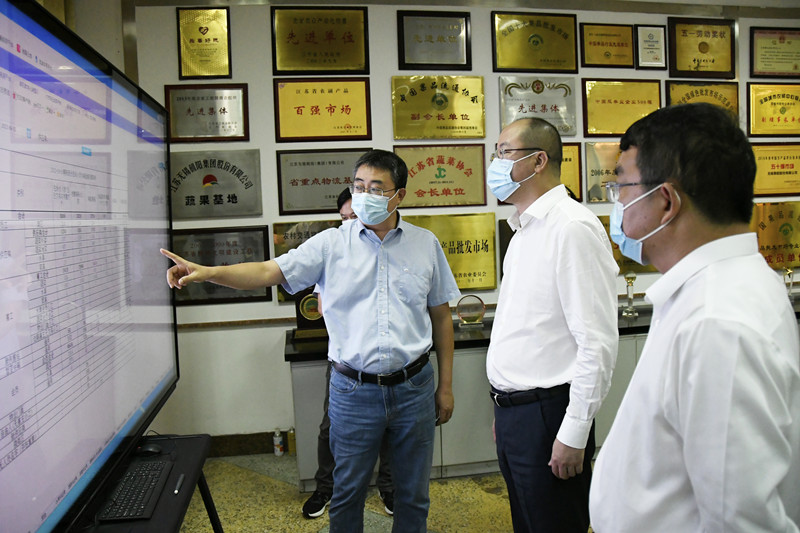 朱书记先后来到朝阳陈列馆、信息中心、水果市场、中停车场,认真听取了朝阳农产品大市场在疫情防控、货源组织、保障供应等方面的具体举措,详细询问了市场对人、车、物的管控情况,市场人员的核酸采样情况及中高风险地区来锡人员的应急处置措施,朱总逐一进行了汇报。