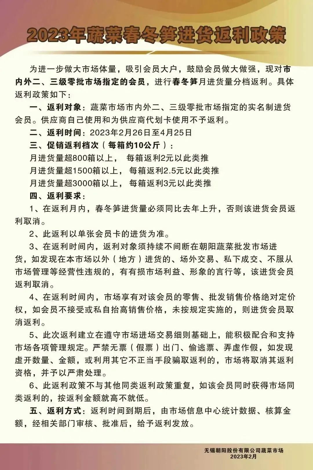 在3、4月份,市场还针对春冬笋进货会员施行返利政策,月进货量达标的,分三档进行促销返利,鼓励会员做大做强,欢迎广大会员前来多多拿货。 (供稿:张柯宇) |