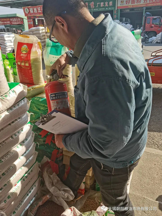 无锡朝阳粮油市场作为以物业租赁为主,在日常管理的过程中,始终紧绷安全生产这根弦不放松,定期、不定期组织安全检查,全面排查安全隐患,按区域落实安全管理责任,确保市场经营安全和消防安全。今年朝阳粮油市场已和市场内所有客户签订安全协议,300余份。开展了包括消防设施设备,用电安全,特种设备使用安全,粮油质量安全等专项检查。 在用电方面,朝阳粮油市场经理室特别安排电工班组对现场管理人员进行培训,切实保障客户安全经营。