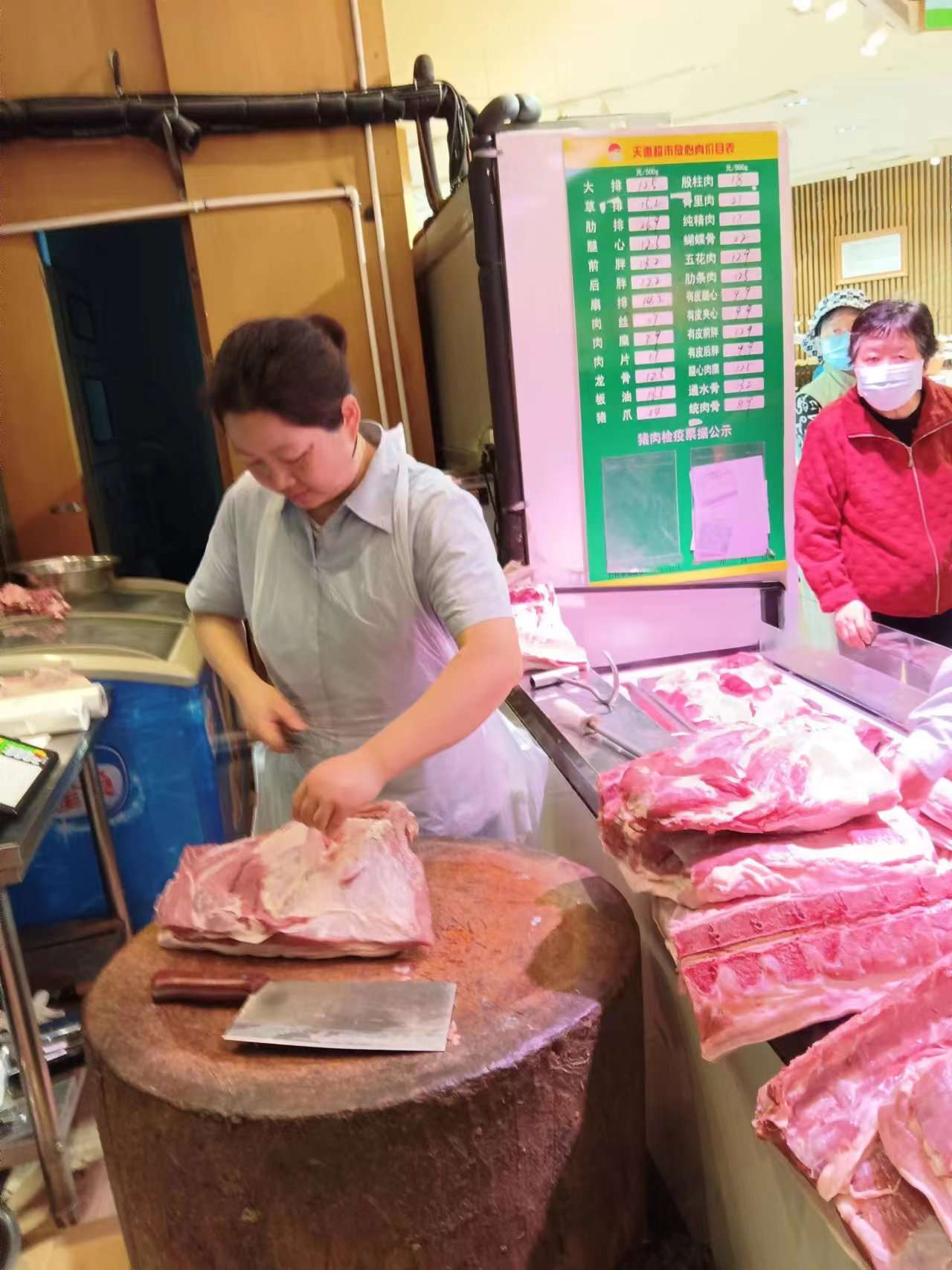 顾云工作劲头十足,作风麻利,在店里是出了名的。2021年,顾云进入天惠超市悦城花园店。每天四、五点准时到店,到店之后分割猪肉、进行售卖等等,早市忙完之后,还会帮忙店里打扫卫生。“平常一天能分割4到5头猪,她工作起来非常麻利,不用怎么操心的。”悦城花园店经理说到。