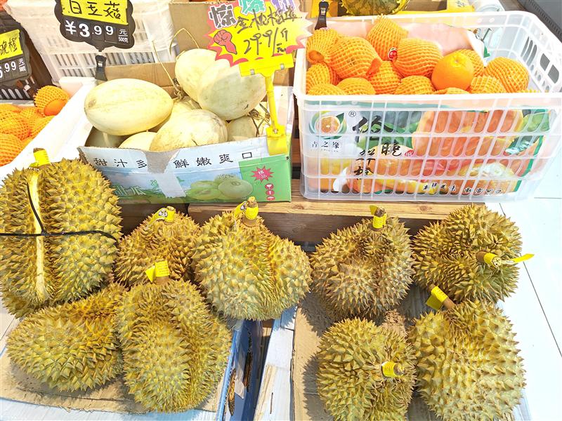 经开区万科信成道的一家水果卖场,最靠里的一片被单独开设为榴莲专卖区,高低错落的三层架子上铺着绿色软垫,十几只榴莲被零散摆放着,从门口刚进入就能闻到浓郁的榴莲香气。“最近榴莲价格下来了很多,本来架子上都放满了,周末两天基本卖完了,只剩下没熟和有瑕疵的果子。”该店店员说,店里的金枕榴莲从3月份的45元/斤左右,降到了39.9元/斤,周末特卖只要29.9元/斤,之前一直观望的顾客都来下手了,“现在买一个5斤重的榴莲,要比以前省好几十元!”