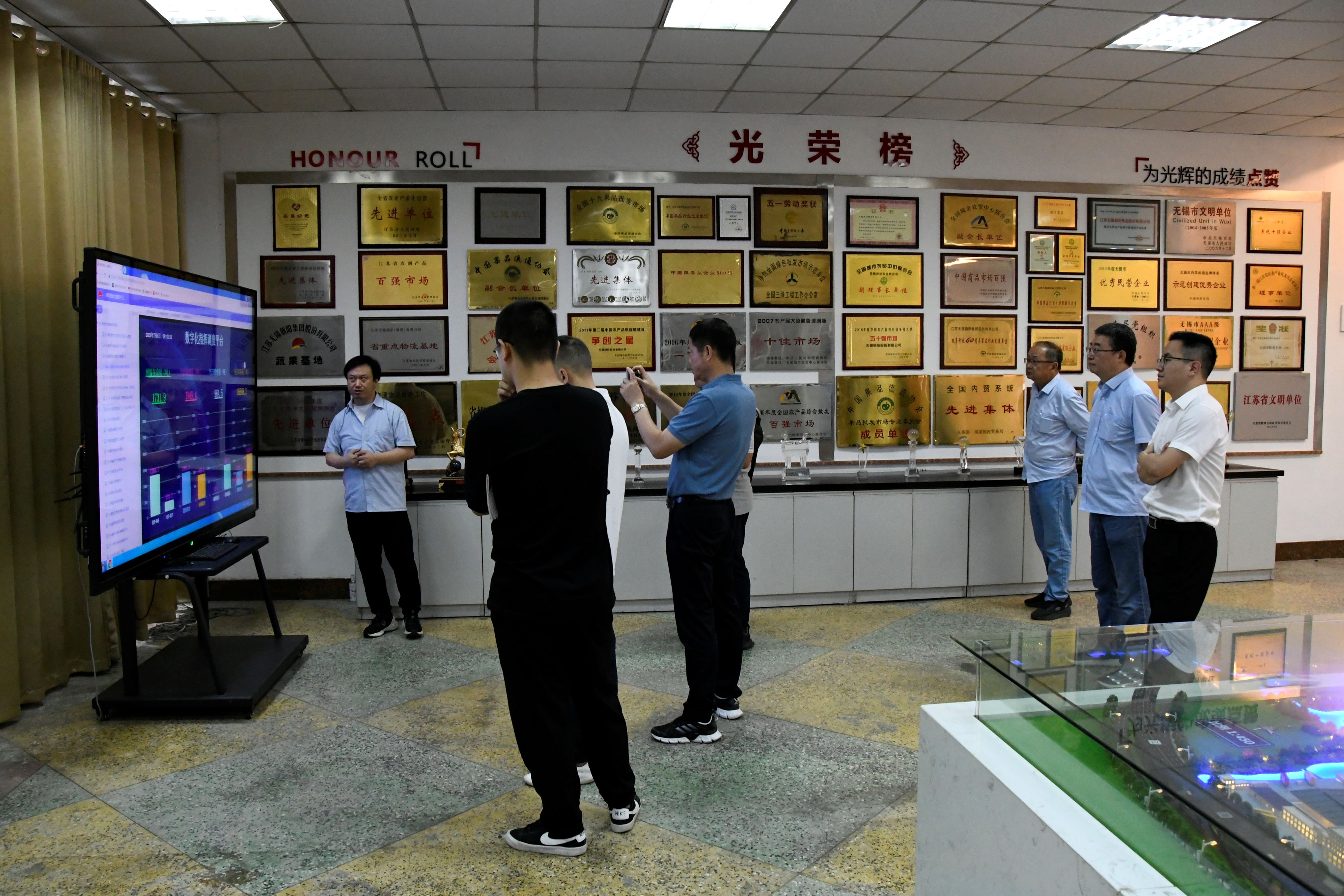 来访一行参观考察了朝阳陈列馆、蔬菜、水果两大市场、信息中心、检测中心、结算中心、万吨冷库、粮油市场等。朱总向来访客人详细介绍了市场的运营管理、建设发展,以及信息化建设方面的情况。来访客人对市场的全程电子化交易模式、大数据平台建设等给予了高度赞誉。