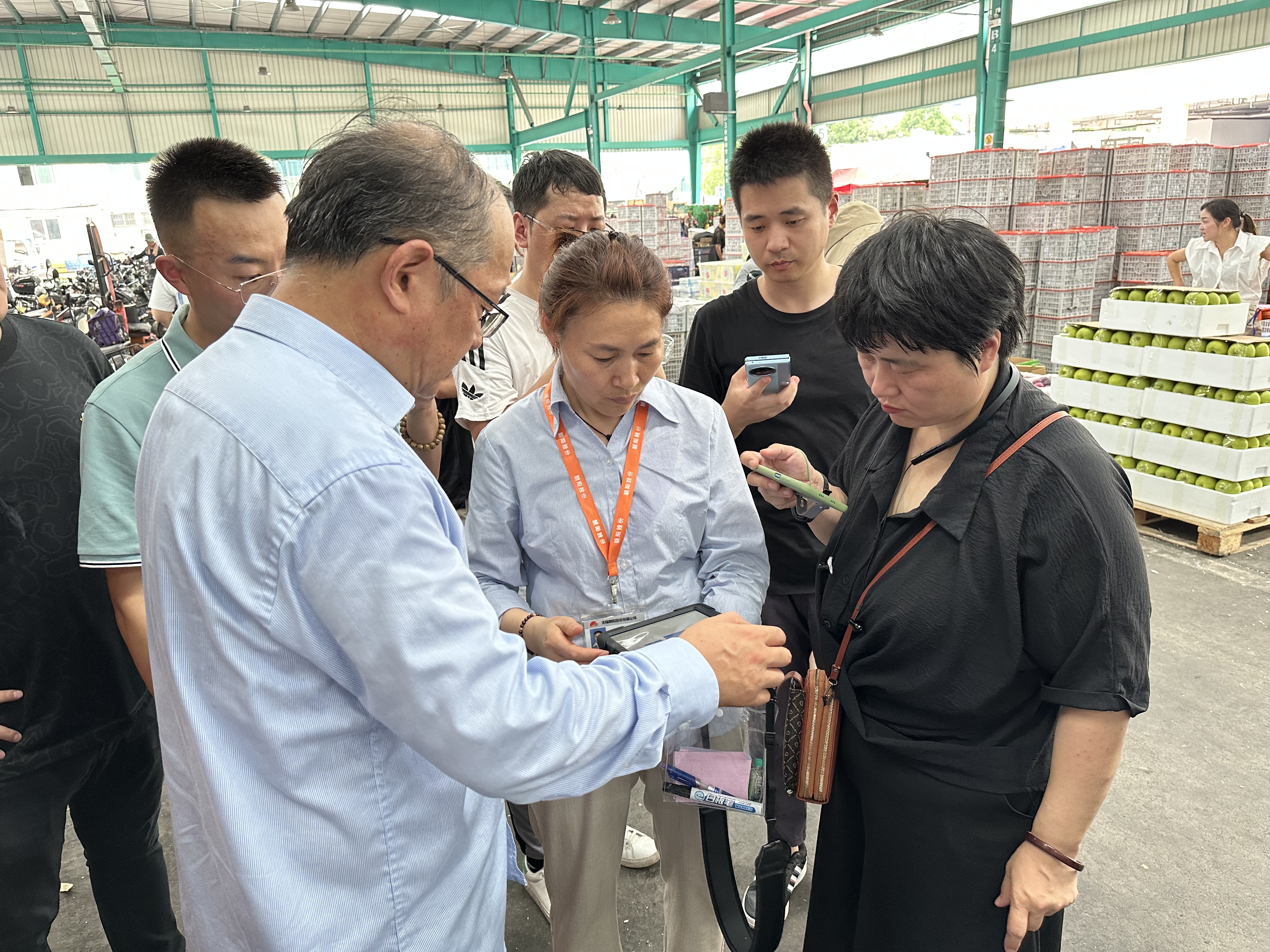 来访一行先后参观了朝阳陈列馆、信息中心、检测中心、结算中心、蔬菜、水果两大市场、万吨冷库及粮油市场。详细了解了朝阳农产品大市场的经营管理模式、电子化交易结算、溯源体系建设、食品安全检测、农产品供应链等方面情况,并给予了充分认可与高度赞誉。