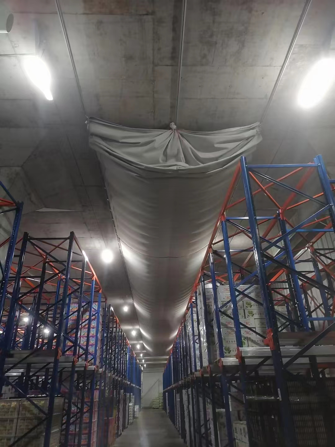 朝阳冷库制冷系统采用布袋风管送风,布袋风管送风均匀,不增加水果、蔬菜的干耗,可以延长果蔬的储存时间,降低损坏率;布袋风管通风系统方便拆装,可以方便进行管道擦拭、清洗。