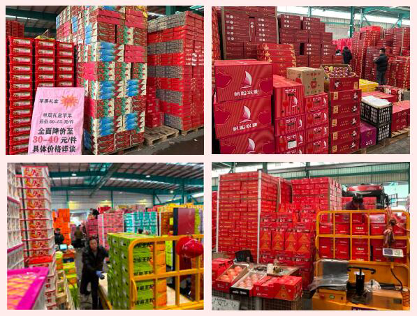目前在市场各个仓位,各种各样的新鲜水果品种齐全,包装多样,货源丰富,礼盒琳琅满目,针对不同种类的水果,礼盒上的吉祥话也有所不同,“苹苹安安”,“大桔大利”,“心想事橙”,以满足市民的不同需求。
