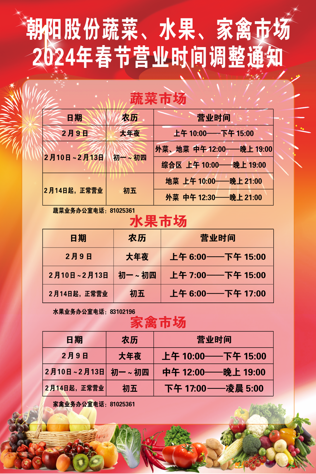 为确保春节期间市场供应,朝阳股份蔬菜、水果、家禽市场营业时间作如下调整: 蔬菜市场营业时间: 2月9日(大年夜) 上午10:00~下午15:00 2月10日~2月13日(初一~初四) 外菜、地菜 中午12:00——晚上19:00 综 合 区 上午10:00——晚上19:00 2月14日(初五)起,正常营业 地菜 上午10:00——晚上21:00 外菜 中午12:30——晚上21:00 蔬菜业务办公室电话:81025361 水果市场营业时间: 2月9日(大年夜) 上午6:00——下午15:00 2月10日(初一)~2月13日(初四) 上午7:00——下午15:00 2月14日(初五)起,正常营业 上午6:00——下午17:00 水果业务办公室电话:83102196 家禽市场营业时间: 2月9日(大年夜) 上午10:00——下午15:00 2月10日(初一)~2月13日(初四) 中午12:00——晚上19:00 2月14日(初五)起,正常营业 下午17:00——凌晨5:00 家禽业务办公室电话:81025361 无锡朝阳股份有限公司 |