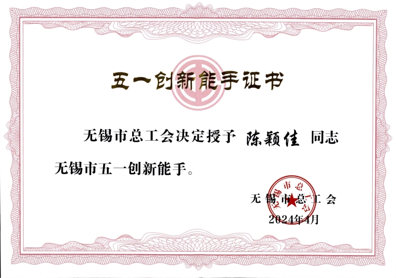 朝阳股份陈颖佳荣获“无锡市五一创新能手”荣誉称号