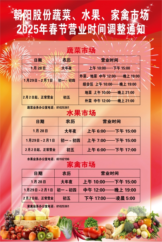 朝阳股份蔬菜、水果、家禽市场2025年春节营业时间调整通知
