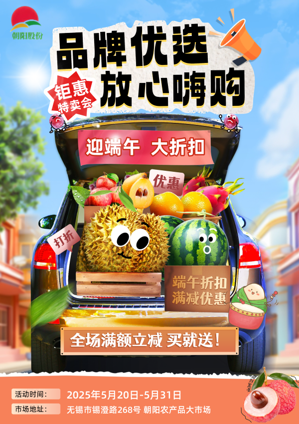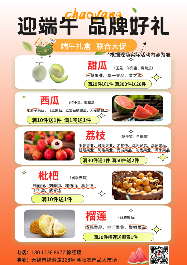 亲爱的会员朋友们,这个端午,让朝阳成为您寻找节日惊喜的起点!在这里,不仅有丰富的端午美食选择,实惠的价格,更有满满的节日氛围和贴心的服务。带上家人,约上朋友,一起来朝阳市场,开启一场属于您的端午水果之旅,让这个端午节,因朝阳市场而更加温馨、美好!