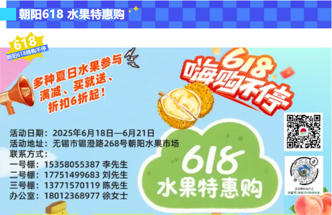 活动期间,更有生日会员福利好礼! 活动日期:2025年6月18日—6月21日 活动地点:无锡市锡澄路268号朝阳水果市场
