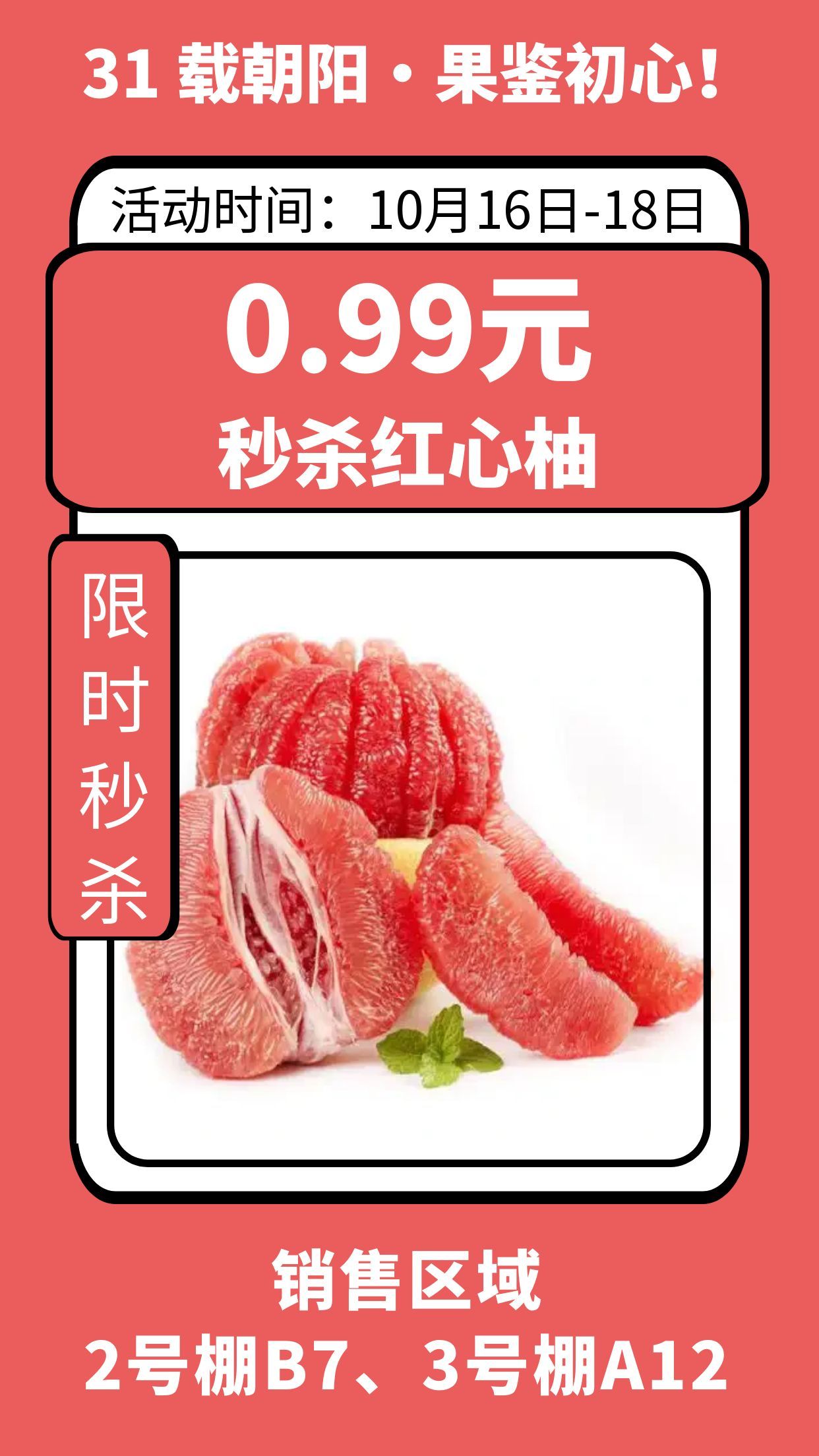 金秋正是吃柚子、蜜橘的好时节,朝阳 31 周年庆特别推出超低价回馈,每天限量供应,手慢无!精选皮薄肉厚、果肉晶莹、酸甜多汁的红心柚,周年庆专属价 0.99/斤;果皮易剥、果肉无籽、口感清甜的蜜橘,周年庆专属价0.9/斤,快来囤满全家吃个够!这两款鲜果均从产地直采,省去中间环节,既保证新鲜度,又把价格压到最低,是本次周年庆不可错过的 必囤清单