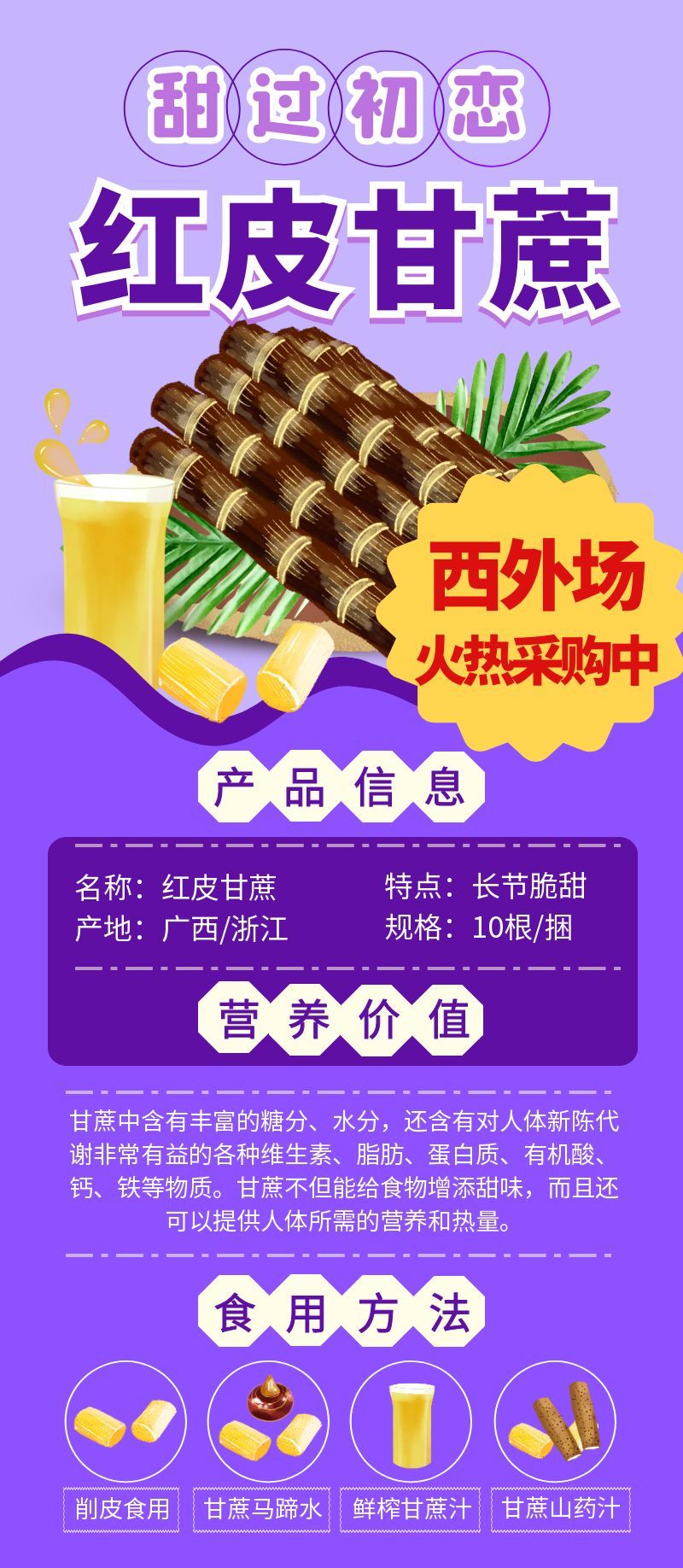 甘蔗甜蜜上市,在水果市场,我们的甘蔗有着与其他批发市场截然不同的独特销售方式——整根销售,不去头不去根。看似简单的销售方式,却蕴含着满满的美好寓意。整根甘蔗,象征着 甜蜜美满,每一口清甜,都能让你感受到生活的幸福滋味;同时,它还寓意着 节节高升,就像甘蔗一节比一节高的形态,愿您在生活和工作中,都能步步高升,收获满满。