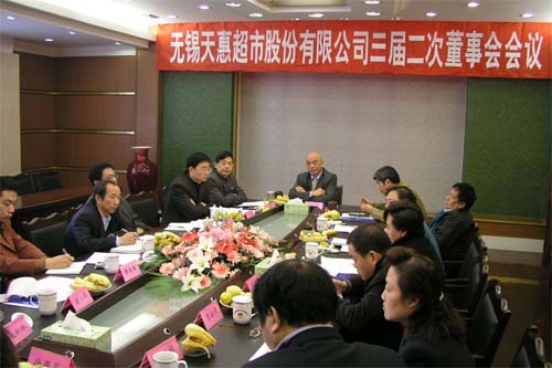 无锡天惠超市股份有限公司三届二次董事会会议于2005年11月25日在无锡召开。会议审议通过了行政工作报告和财务工作报告。确定了2006年度目标。并通过了股权结构调整的预案。会议决定于2005年末召开第八次股东大会。