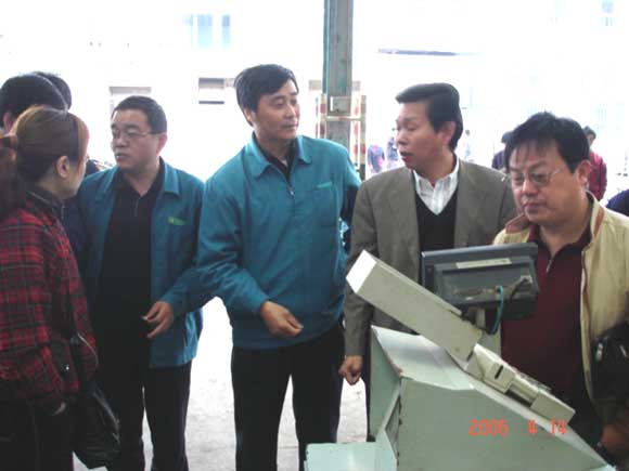 在朝阳农产品大市场参观期间,朝阳股份副总经理汪海良、汤建兴分别向杭州客人介绍了市场经营管理和使用电子磅秤交易系统情况。双方就大市场建设和经营管理等方面进行了交流与探讨。