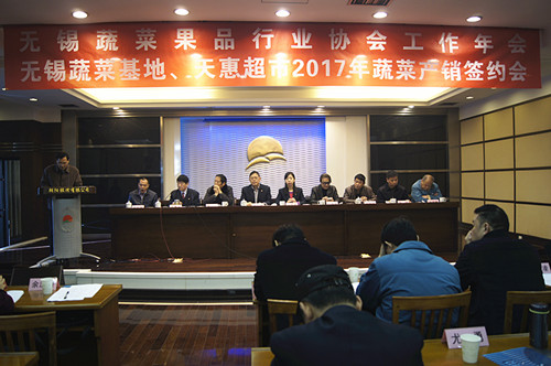 无锡蔬菜果品行业协会年会、无锡蔬菜基地、无锡天惠超市股份有限公司2017年蔬菜产销签约会于12月7日上午,在朝阳股份农产品市场二楼会议室隆重召开。蔬果行业协会会员、基地菜农、朝阳股份和天惠超市主要领导200余人出席了会议。